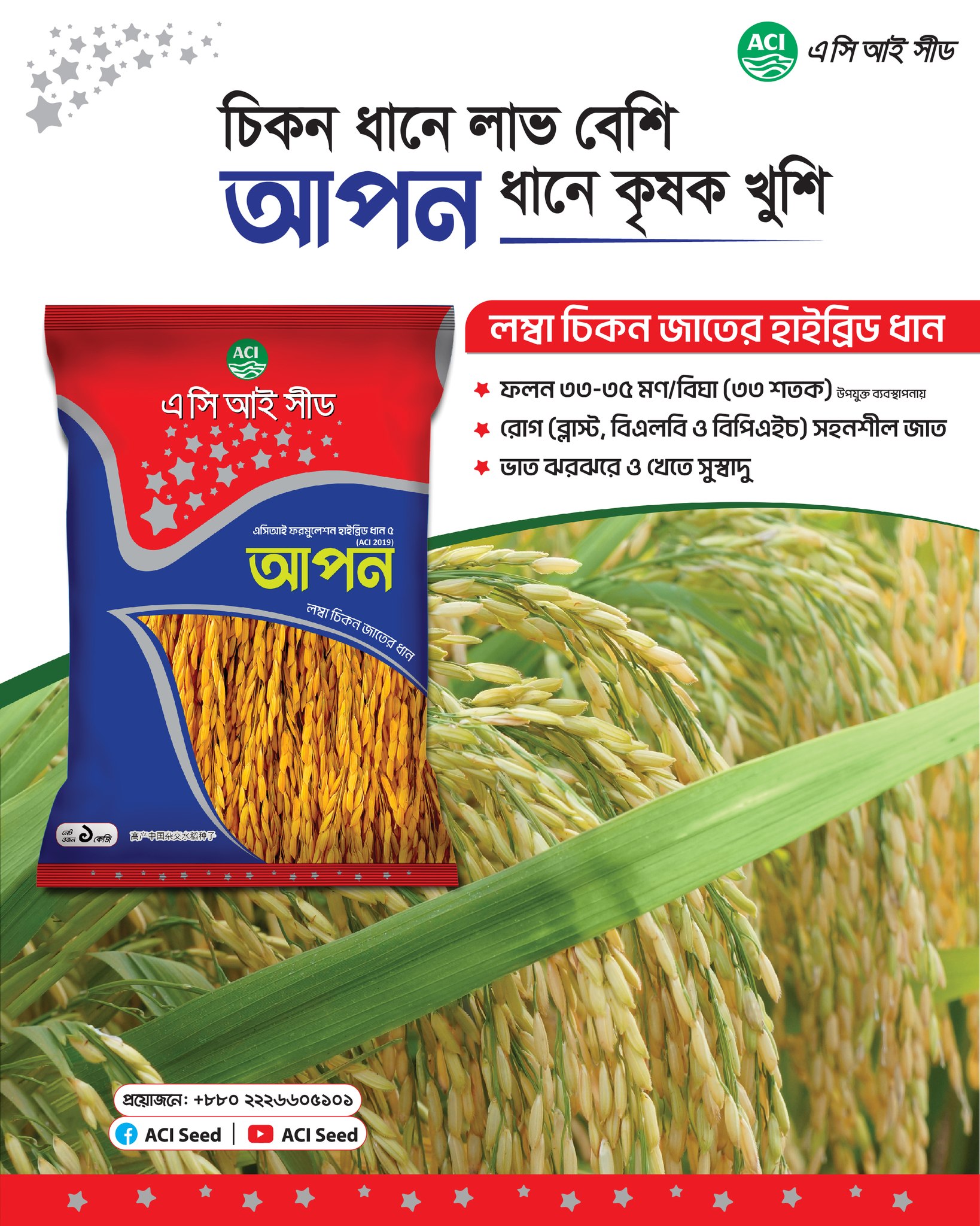 এসিআই সীডের বোরো মৌসুমের লম্বা চিকন জাতের হাইব্রিড ধান “আপন”